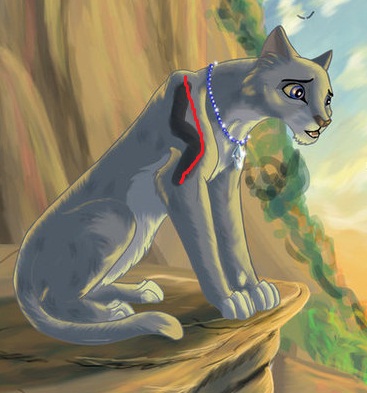 Во-вторых, крупное кошачье в принципе не может отодвинуть голову назад настолько, чтобы грудная клетка выступала вперёд больше, чем шея. Поэтому шея тоже исправлена и для наглядности позвоночник отмечен синим.
