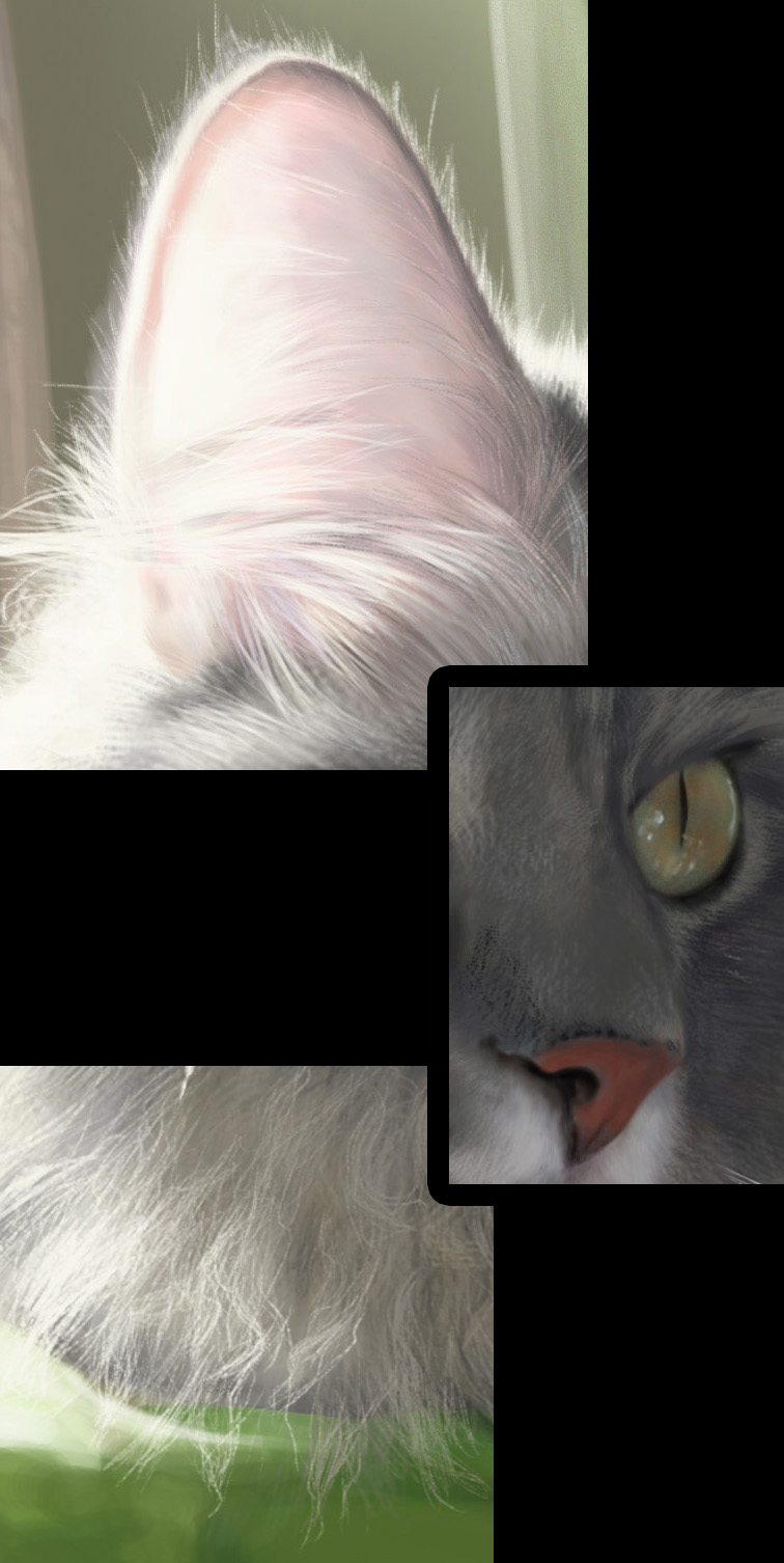 Основную массу шерсти рисую стандартными кистями. На этом рисунке активно злоупотребляла кистью собственного изготовления, но это не принципиально - не смогла найти часть стандартных. Отдельные волоски и пряди рисовала простой круглой кистью. Также отдельно нарисованные на общей массе волоски придают реализма (кое-где мне тут было лень их рисовать).