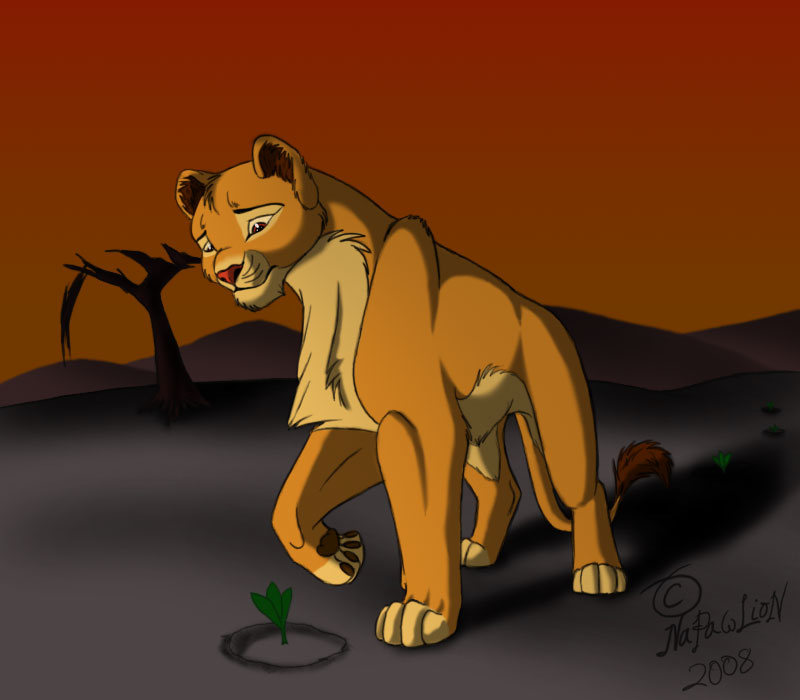 С учетом яркости освещения на льве, логично было бы предположить, что настолько же сильно освещение будет и на остальной местности, включая почву. Настолько косое освещение будет сложновато изобразить, но получиться должно красиво. С другой стороны, можно предположить, что лев освещен лучом. Тогда с бэком будет чуть попроще