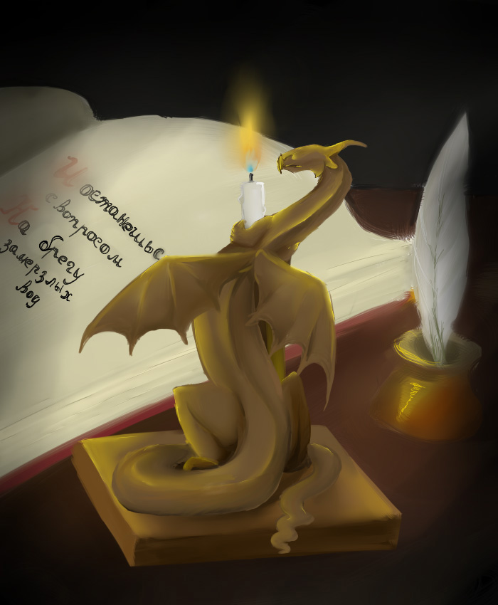С освещением косяки. Попробуй провести линии от свечи и посмотреть, куда они должны попасть (и с какой стороны), а куда нет. А то у тебя вместо рефлексов кое-где прямое освещение получается, и теней не хватает. И еще "вопрос к размышлению" - что на картинке должно быть самым ярким, светлым? Видимо, свеча, которая все освещает. Но самое светлое и яркое у тебя сам воск свечи и лист книги, непорядок.
