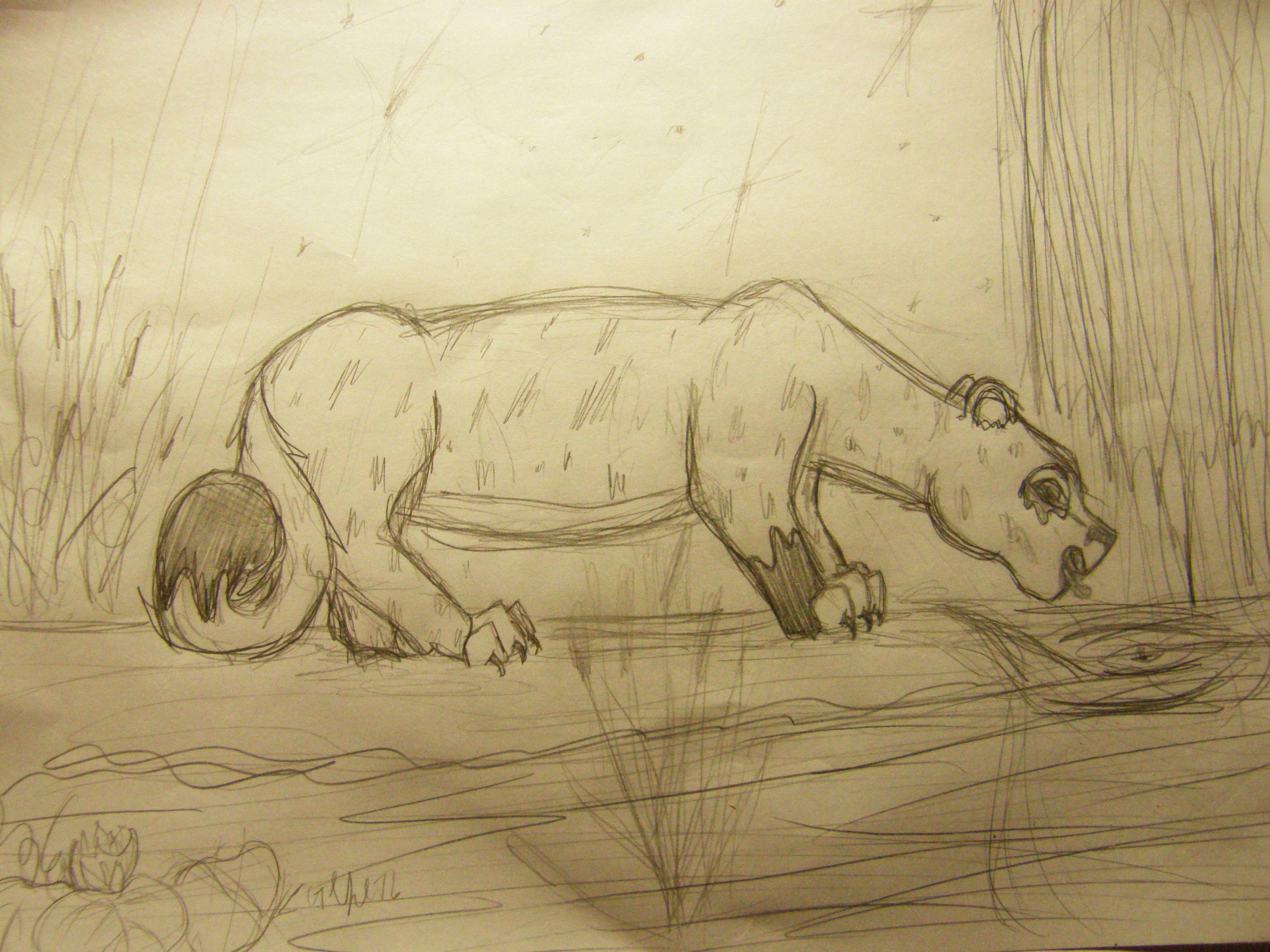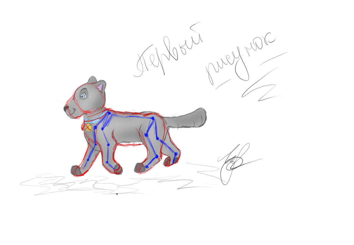 так. начинаем разбор полётов :) ничего страшного, если я накалякаю ? Синим я обозначила кости, красным - линии. Начнём слева направо. Если это львёнок (судя по лапам), то морда у него слишком длинная и резко опускается вниз (так не должно быть). И узковата немного. Насчёт ошейника - он не может так сильно провисать (аж до лопаток !) и кулон на нём в таком положении животного не был бы виден целиком, а только небольшая его часть прямо непосредственно на линии груди (если, конечно, кулон спереди а не сбоку). А если кулон плоский, то тогда была бы видна одна полоска. Шея коротковата, но на рисунке я не нашла способа её удлинить. Грудь очень большая, должна быть как минимум в два раза меньше. Сверху, между спиной и шеей, должна быть видна лопатка и линия лапы (красным обозначенная). Правая лапа животного (левая от зрителя) должна быть чуть потолще (даже я, наверное, тонкую сделала :hmm: ). Живот не может уходить вверх (только если он совсем оголодал или втянул живот :lol: ) Он, наоборот, немного провисает (там же нету мышц, там кожа и шерсть). Бедро великовато и знаменитая ошибка начинающих, подробнее о ней здесь viewtopic.php?f=2&t=197 ещё кое что - при таком развороте пальцев (всмысле, при виде сбоку) не видно третьего пальца (только в некоторых случаях). Насчёт ушей, хвоста и глаз не знаю, возможно, это особенность твоего персонажа.