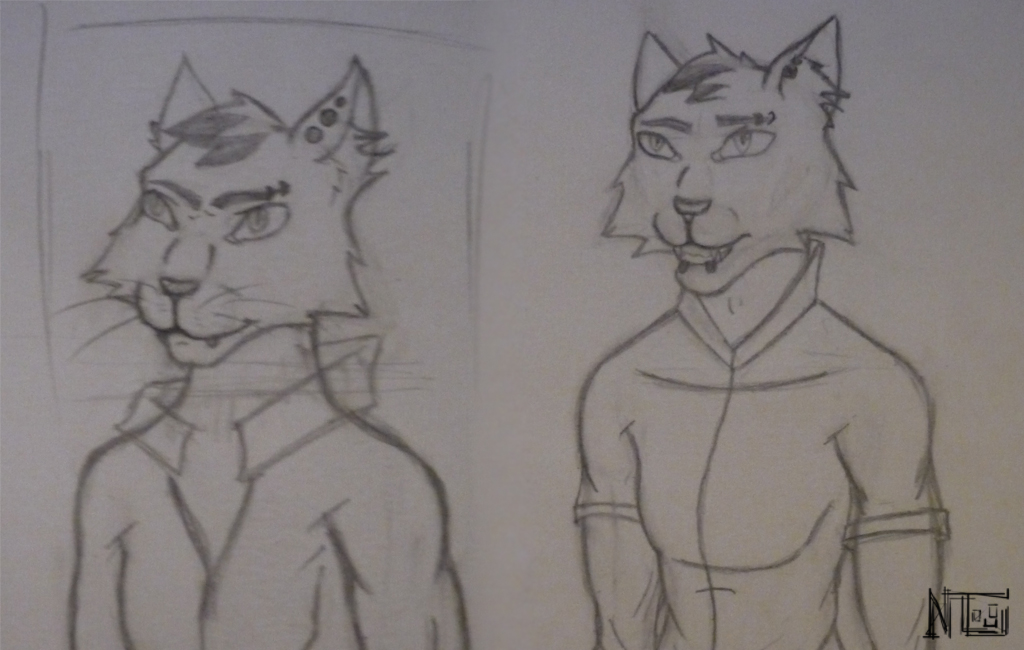 Вот как бы пытался нарисовать нового персонажа для рассказа, сделал два скетча, должен быть кот, но вроде не очень похож, подскажите что исправить ^_^"