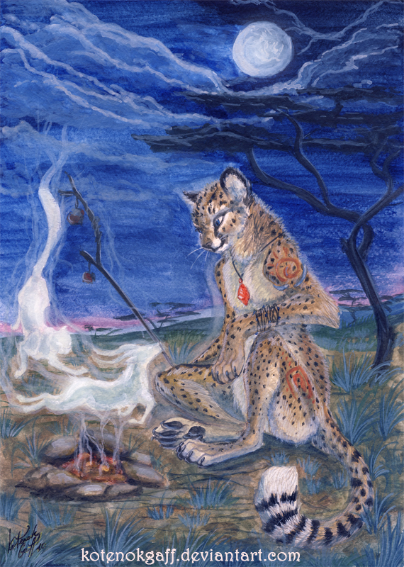 "Ритуал охоты" понравился больше "Вызова дождя" в первую очередь тем, что антропоморфность гепарда там совершенно не режет глаз - кажется вполне естественной. Удивительно даже. Плюс за счет темных тонов, фигур в дыме костра и бог его знает чего еще, атмосфера рисунка очень загадочна. Захватывает.