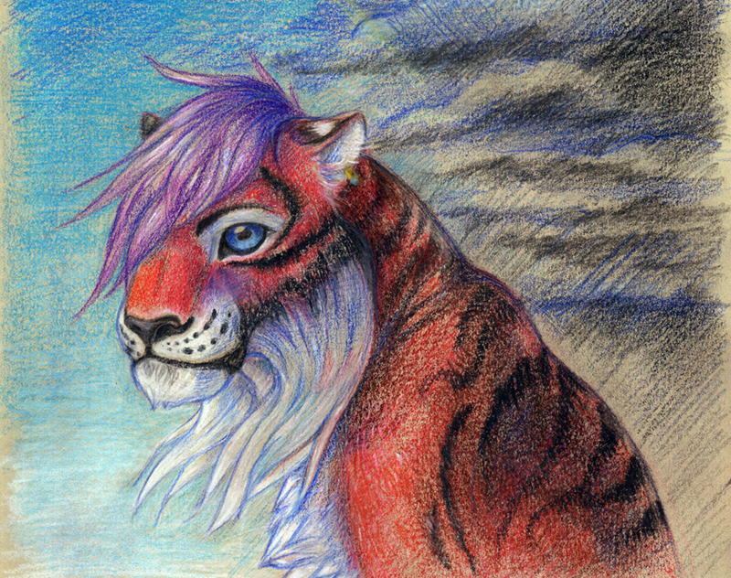 У тигра угол носа по отношению к морде я бы сделала поменьше, глаз меньше и ближе к носу, потом из-за этой чёлки как-то плохо воспринимается вся морда (не стала делать чёлку прозрачной, как её часто рисуют). Или нарисовала бы перпендикуляр от носа к пасти правее. Но не суть важно. Всё рано уже эту кривость никак не исправишь. Блин, вообще нет прогресса >_<