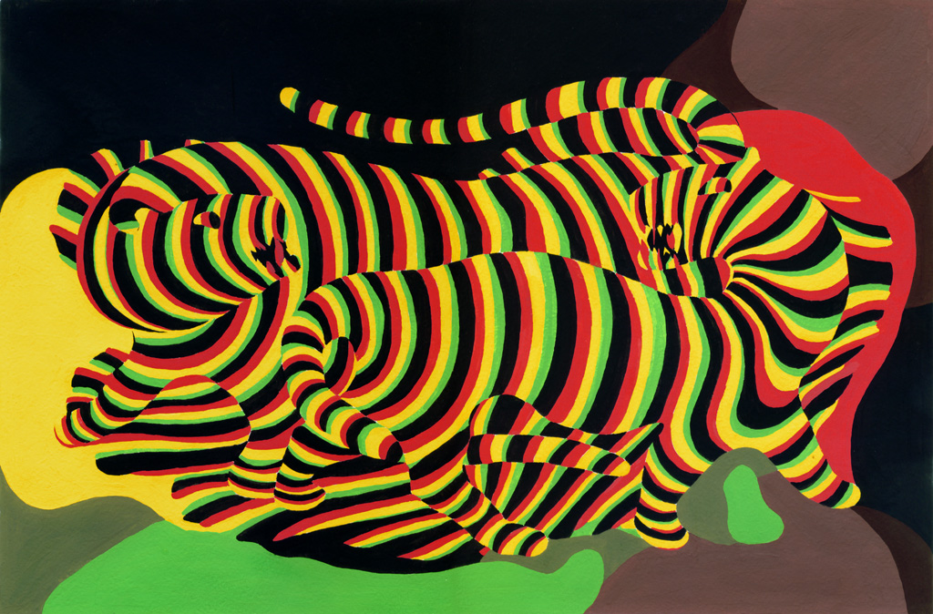 Очередной проект в институте включает в себя копию работы известного художника. Копию не точную, а "усредненными" цветными пятнами. Мя не могла не взять "Тигров" Вазарели http://irea.files.wordpress.com/2008/11/4dpict.jpg Копию цветов брала с качественной репродукции в книге, там цвета заметно ярче, чем по ссылке. В принципе, цвет - единственное, что реально важно в этом задании. Рисовала темперой.