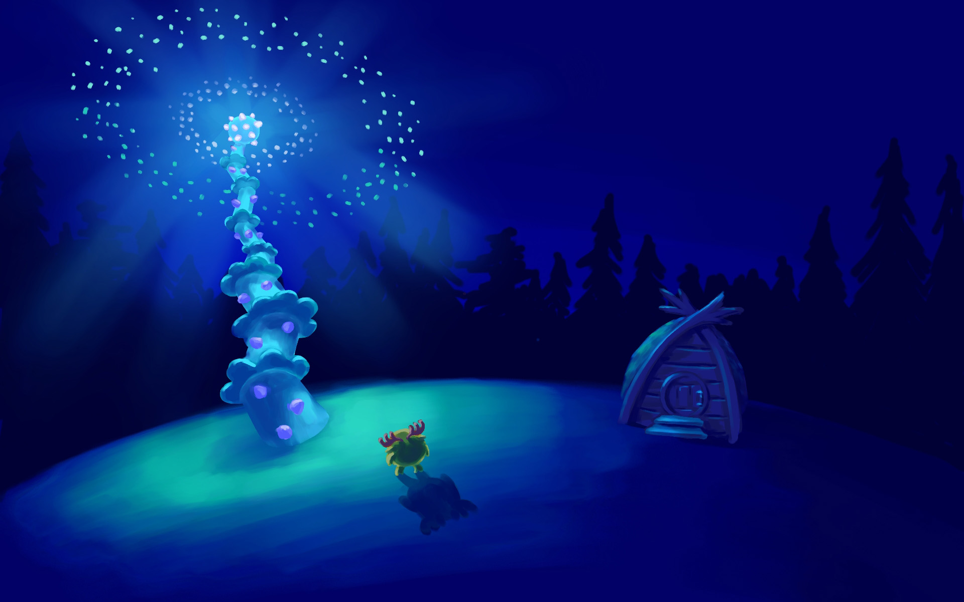 Опять Алекс вдохновил. На сей раз на фанарт по смешарикам. Это работа не законченная, она так и останется в стиле то ли наброска, то ли концепт-арта, но более законченный и смотрибельный вид придать хочется. Но есть у мяу некоторые сомнения. В частности по композиции - положение домика, надо ли делать елки ровными или наклонить их в стороны/к центру; цветовым нюансам - по светлячкам (внешний круг) и небу (сама разберусь, когда солнце перестанет в монитор светить); деталям - надо ли рисовать траву и цветы в ней.