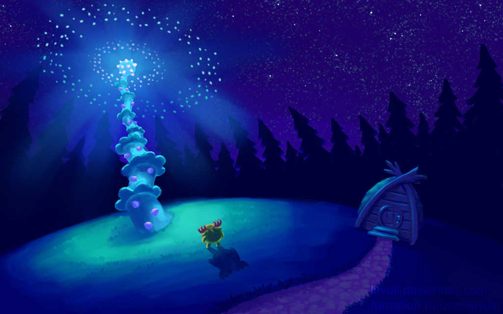 Опять Алекс вдохновил. На сей раз на фанарт по смешарикам. Это работа не законченная, она так и останется в стиле то ли наброска, то ли концепт-арта, но более законченный и смотрибельный вид придать хочется. Но есть у мяу некоторые сомнения. В частности по композиции - положение домика, надо ли делать елки ровными или наклонить их в стороны/к центру; цветовым нюансам - по светлячкам (внешний круг) и небу (сама разберусь, когда солнце перестанет в монитор светить); деталям - надо ли рисовать траву и цветы в ней.