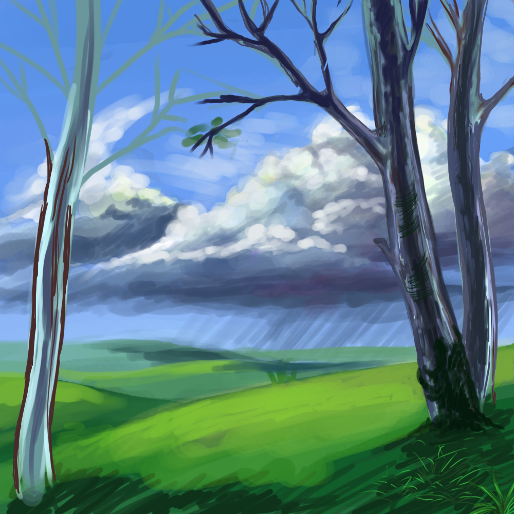 Рисунок классный, цвета яркие, но не резкие - свежие, я бы сказал. Ну вот словно этот дождь, что вдалеке, он уже успел пройти тут и умыть траву и вьюн на дереве.