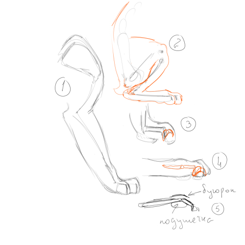 И опять возвращаемся к задней лапе, но только теперь к стопе. Это номер 4 и 5. Можешь объяснить, почему над пальцами ты нарисовала такой бугорок? там его быть не должно. Смотрим на скетч. Дело в том, что, если бы не было подушечки на лапе, то кости лежали бы точно по прямой, но так как она есть, то она является этаким возвышателем, отчего фаланги пальцев немного наклонены. 5 номер - это примерная схемка, гротеск, чтобы было четче это видно. Поэтому над суставами пальцев (но не там, где нарисовала ты) есть бугор. А пальцы и суставы фаланг наоборот сглажены.