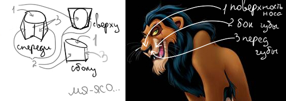 Вот я смотрю на неё и думается мне, что если он повернётся в профиль, то выглядеть будет примерно как верхний левый рисунок, хотя должен выглядеть как правый. Это всё изза перемычки на губе, она у тебя не в ту сторону наклонена. А ещё мне не нравится глаз, он не имеет глубины, хотя должен сидеть в ложбинке. У меня получился совсем не Скар, но это не имеет значения) Просто примерно посмотри, как и что должно быть. И да, думай плоскостями. Посмотри на изображение правее - плоскости глаз как будто уходят вглубь.
