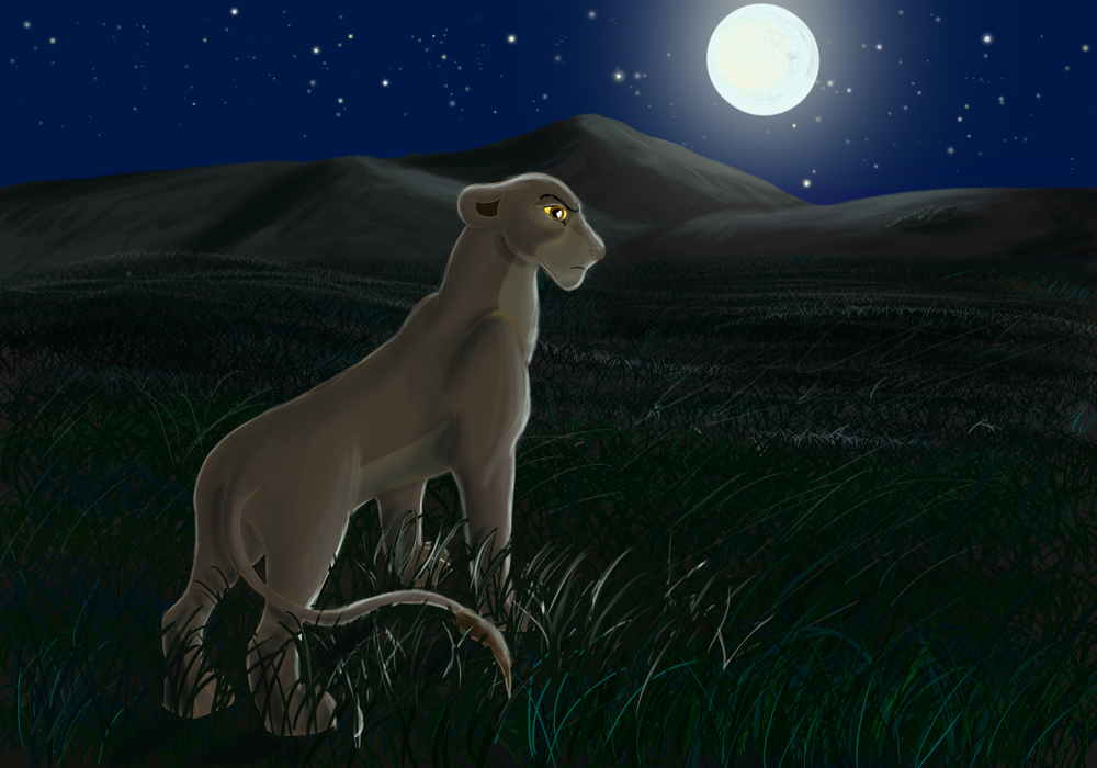 Здесь львица уже освещена луной, смотрится реалистичнее. Поменьше насыщенности в покраске, и будет замечательно!