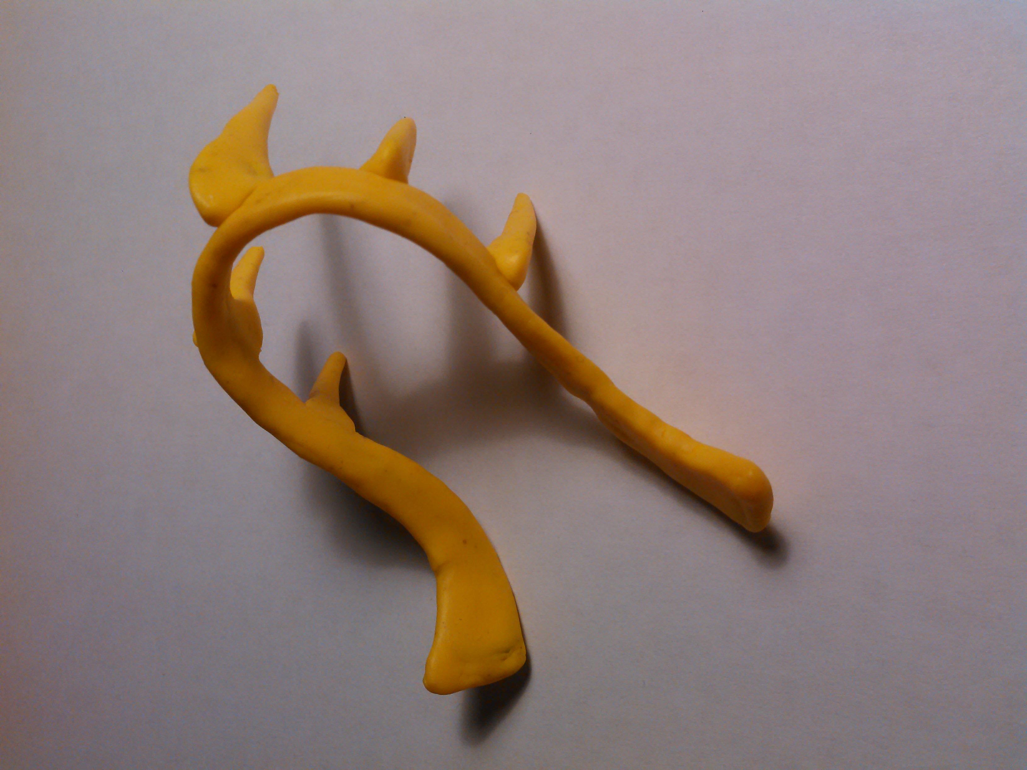 Верхний зубец должен был быть изогнут больше, и симметрию я всё же завалил, но в целом неплохо для первого блина. Материал мне понравился - работать с ним почти так же просто, как с пластилином, и он идёт уже пигментированным, так что не надо потом изощряться с покраской. (До этого я работал только с пластилином, из-за чего от некоторых скульптур сохранились только фотографии.) Постараюсь закупить больше цветов и использовать эту штуку вместо пластилина.