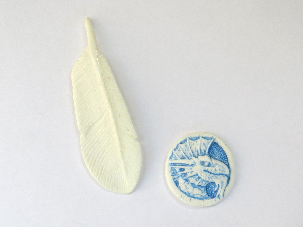 Заказной дракончик, над которым пришлось посидеть, и вырезанное фактически за вечер перышко. Вырезано из коровьей кости. Имевшаяся кость задала перышку очень интересный натуральный изгиб, который, к сожалению, не виден на этом фото. Дракон тонирован синей краской с добавлением перламутра (чего на фото, опять же, не видно). В стержне пера для крепления есть дырочка, а дракону еще надо добавить петельку.