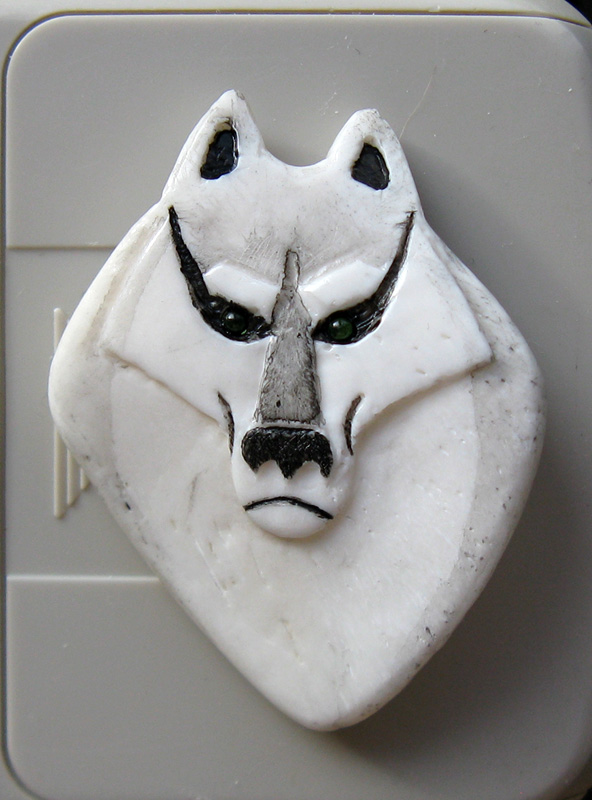 Допилила и покрасила косточку, почти 4 см в длину. Думается, для первого раза вполне неплохо вышло. Вставила стеклянные зеленые глазки, получила эффект, как в мультфильме - там то виден зеленый цвет, то он становится черным. Брызнула лаком, чтоб тушь не растеклась. То ли лак перепутала, то ли он так впитался в кость, но после еще одной полировки косточка стала полуглянцевой, не потеряв цвет, решила так и оставить