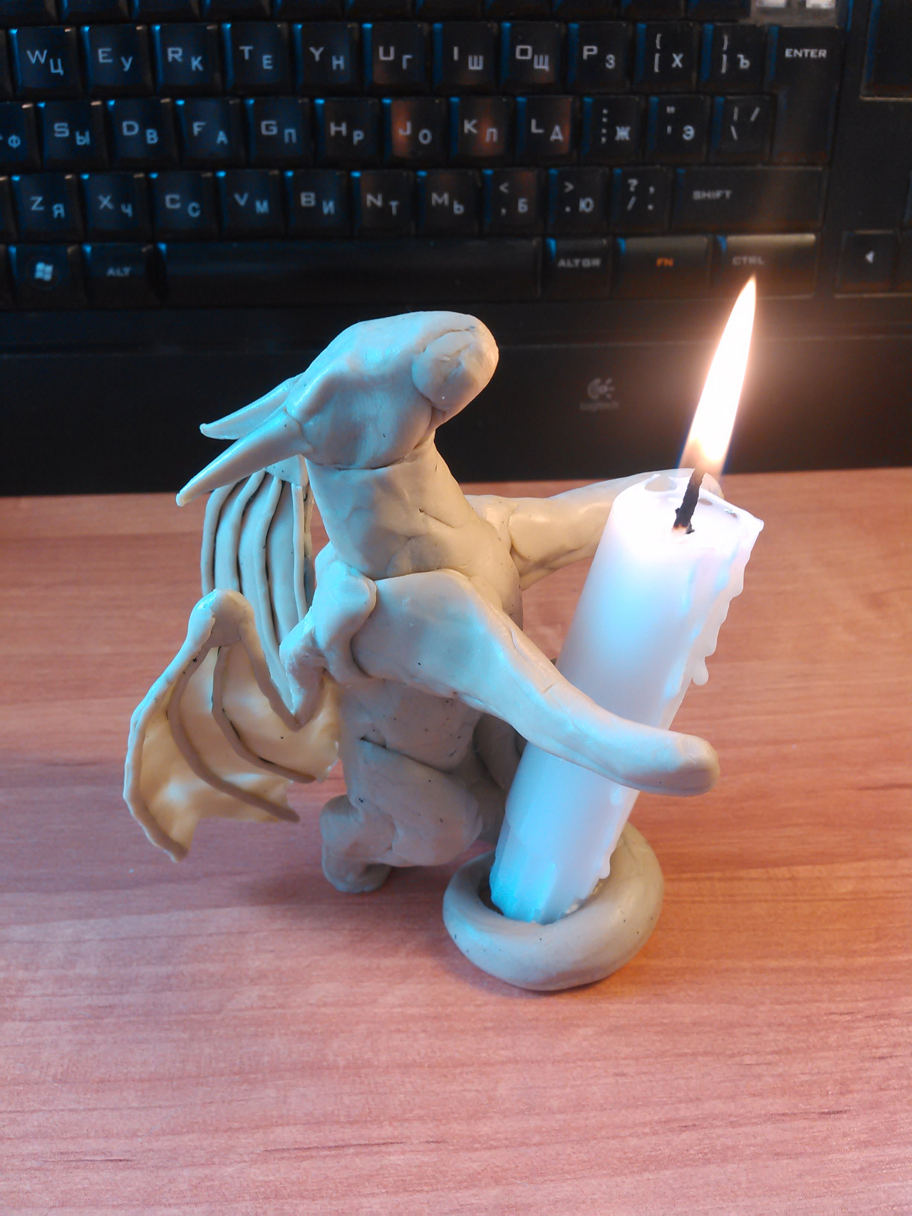 Это пока пластилиновый макет. По результатам макета предполагалась версия из запекайки, но пластилин на пару с проволокой уже отлично держат довольно тяжёлую парафиновую свечу. Так что вместо того, чтобы переделывать всё в запекайке, попробую детализировать пластилин.