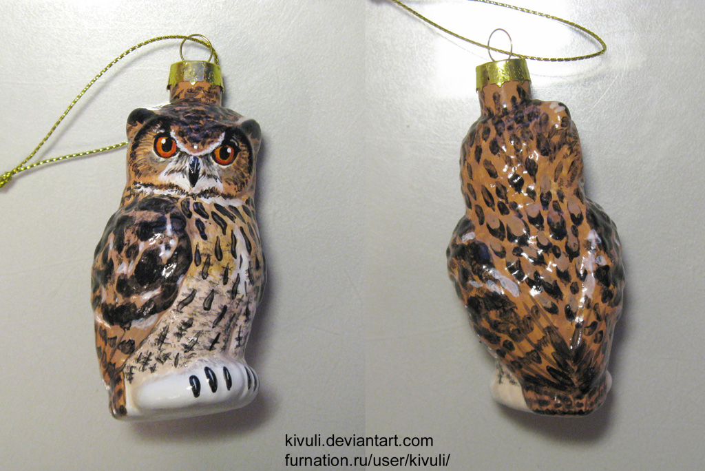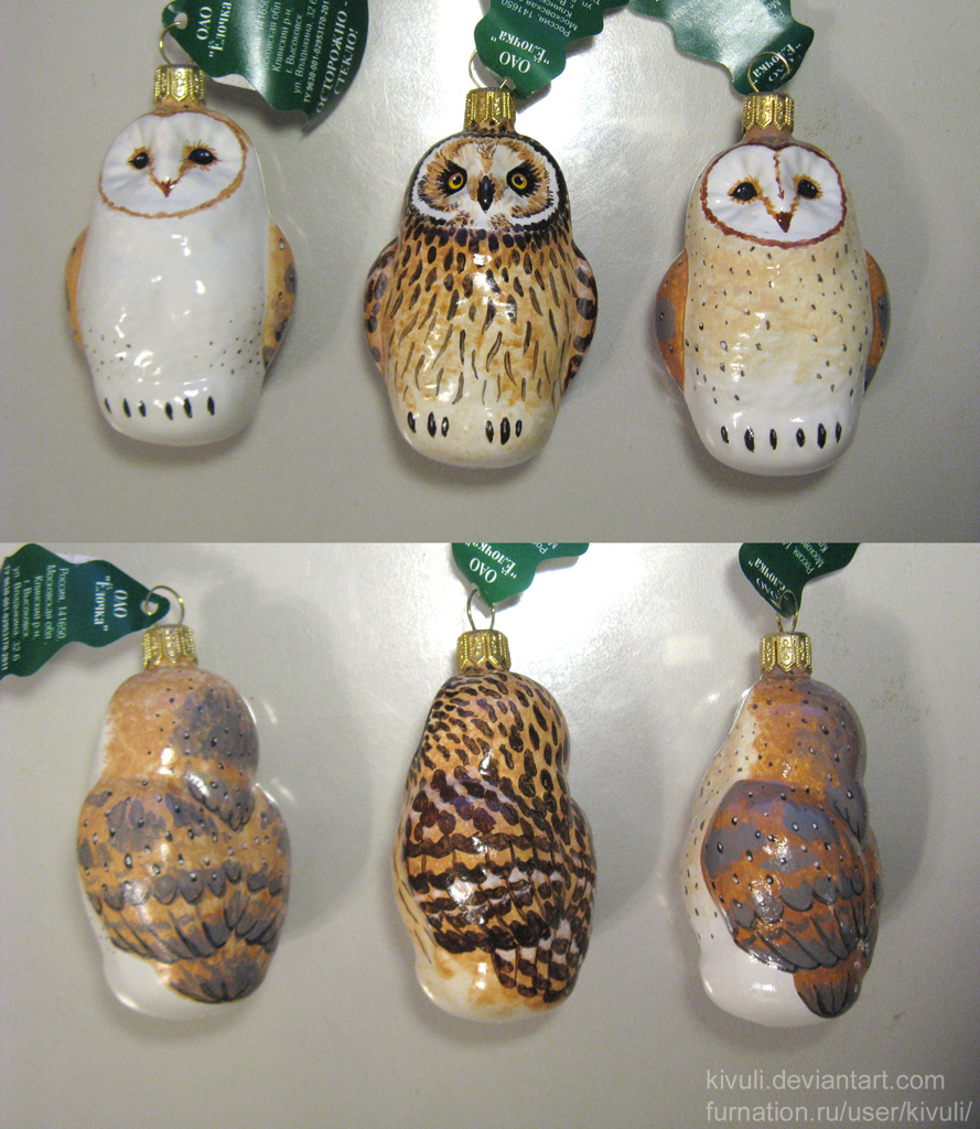 Сов перелепливать не пришлось, они и так симпатичные. Надо было только отмыть от дефолтной покраски, оплавить кончик отломанной трубочки (а то они так и норовят отломиться, когда достаешь крепление) и, как показала практика, отжиг (медленный нагрев и остывание, чтоб убрать напряжения в стекле) тоже был не лишним — одна сова начала трескаться в руках при помывке, хотя особо на нее не давила.