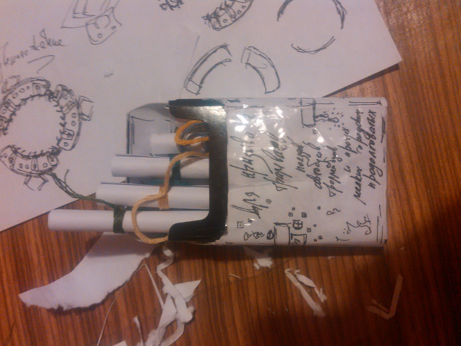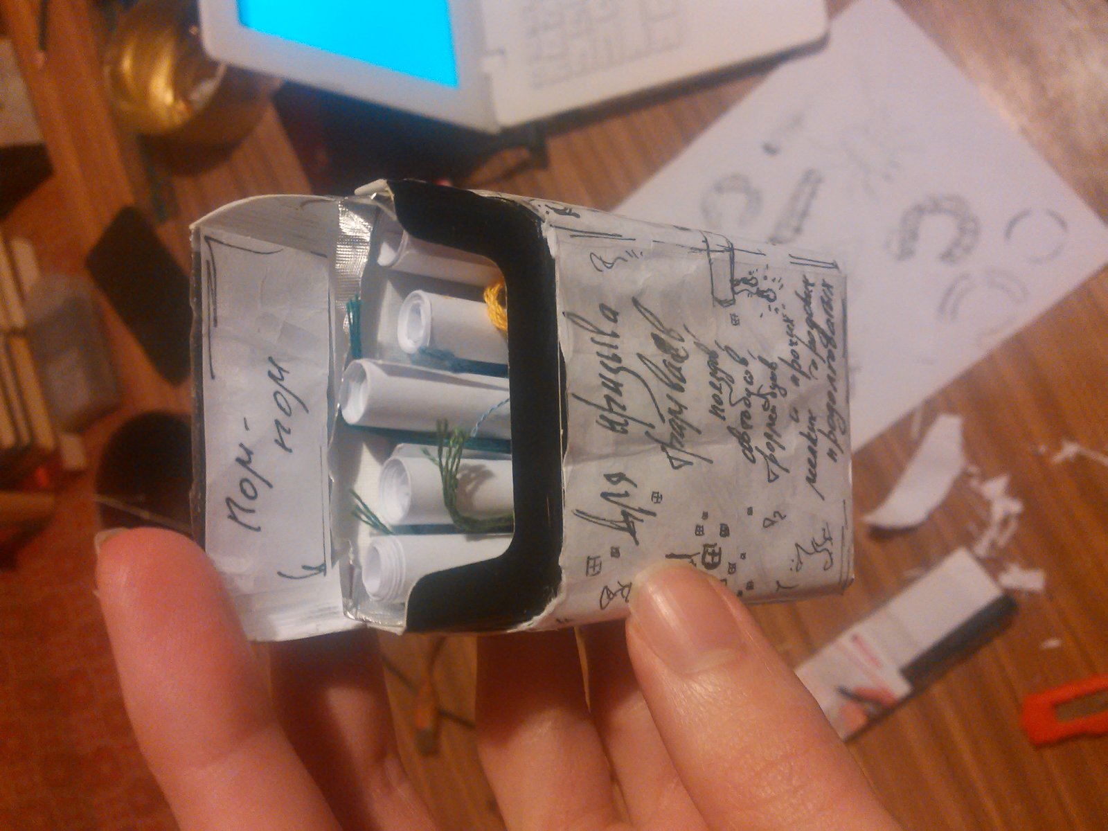 А сегодня ночью мы с получателем пуговиц сидели и обклеивали бумагой пачку из-под сигарет, тоже в подарок. Ещё до нас было подмечено, что стоит только раскурить сигарету на остановке, как к ней тут же подходит нужный трамвай (по закону подлости). Но из нас никто не курит, поэтому мы делаем специальную пачку для призыва трамваев, в которой лежат не сигареты, а скрученные рисунки. Даже если их сжигание трамвай не призовёт, хотя бы ждать его будет не так скучно.