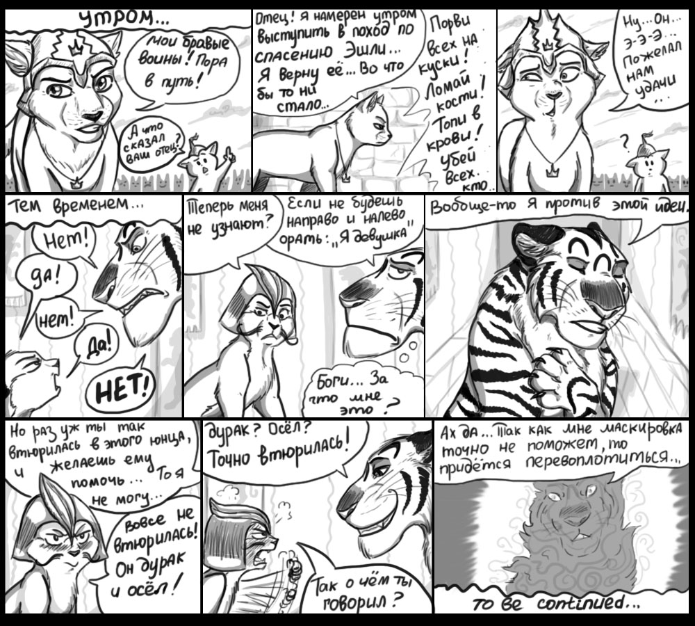 Усы, допустим, можно опустить по статегическим причинам, а вот "полоски-раскраску" стоило бы соотнести с анатомией. На щеке, как минимум. Побрюзжал. Ладно. Все равно хорошая работа. Можно "обложкой" к комиксу выпускать. Кстати, все в нетерпении... с сентября уж продолжения ждем